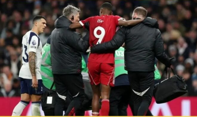 Alexander Isak was injured after being caught by Micky van de Ven in Liverpool’s win over Spurs